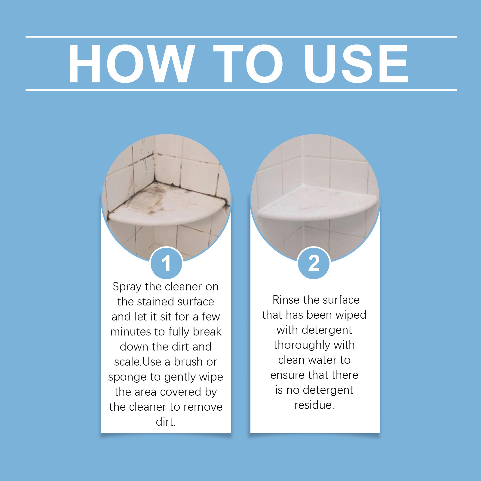 Apply: Spray the cleaner on the stained surface and let it sit for a few minutes to fully break down the dirt and scale. Use a brush or sponge to gently wipe the area covered by the cleaner to remove dirt.